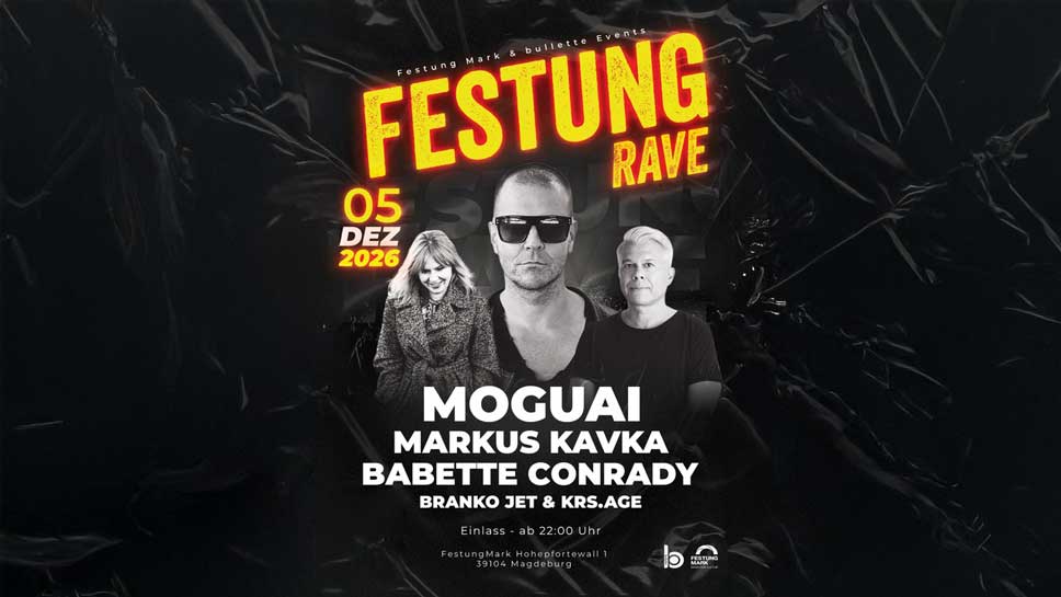Erlebt eine unvergessliche Nacht mit Techno-Ikone MOGUAI, Markus Kavka und Babette Conrady. 05/12/26 ab 23h in der Festung Mark in Magdeburg. Einlass ab 22h, P18, strenge Tür.